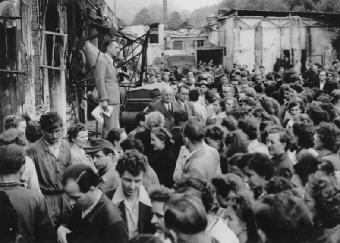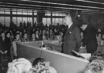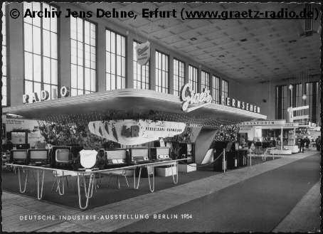 Anfang der 50er Jahre trumpfte Graetz mit einigen technischen Innovationen in den vorderen Reihen der deutschen Radio- und Fernsehgeräte- Hersteller. In der Nacht vom 8. zum 9. Mai 1952 brannte das komplette Obergeschoss des Graetz- Werkes 1 ab... (Werkfoto Graetz): Ansprache des Herrn Erich Graetz an die Belegschaft am Tage nach dem Brand. ---------------------------------------- Foto (Werkfoto Graetz) oben: zur Eröffnung des neuen Graetz-Fernsehwerkes IV in Bochum hält Herr Erich Graetz eine Ansprache an die Belegschaft. 1200 neue Mitglieder arbeiten bereits in diesen zu den modernsten Fernseh-Fertigungsstätten gehörendem Werk. (Originaltext zur Veröffentlichung) Deutsche Industrie-Ausstellung Berlin 25.9. bis 10.10.1954 - der Messestand von Graetz Radio und Fernsehen. Den Höhepunkt der Graetz - Radio- Musiktruhen- und Fernsehproduktion bildeten die späten 50er Jahre mit etwa 13 Produktionsstandorten und ca. 7.000 Mitarbeitern. Am 1. Juni 1960 übernahm die Graetz KG die Fertigungsbetriebe der Firma "Sander & Janzen OHG" (SAJA) in Berlin und Duderstadt. Graetz wird die Tonband- und Diktiergerätefertigung unter eigenem Namen fortsetzen. Mit den beiden neuen Fertigungsbetrieben, dem Werk VIII und dem Werk IX der Graetz KG, sind jetzt 8000 Beschäftigte in insgesamt 9 Graetz-Werken tätig. Zu Beginn des Jahres 1961 gehen die Firmengruppen SEL (Standard Elektronik Lorenz) und Graetz eine Verbindung ein, zum Ende des Jahres scheidet Erich Graetz aus dem Unternehmen aus. Hier die Mitteilung als PDF.