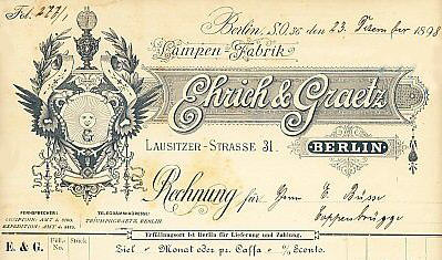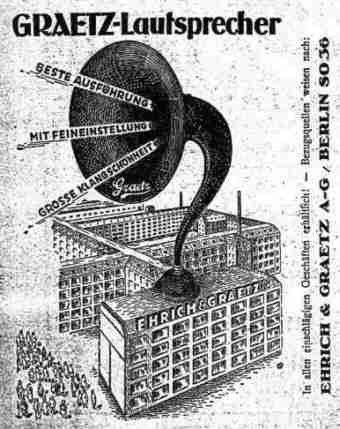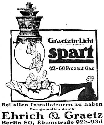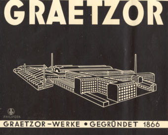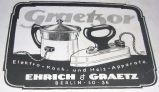 Die Marke GRAETZ im Wandel der Zeiten. © Jens Dehne Zu Beginn eine kurze Zusammenfassung von Informationen und Fakten zum Familienunternehmen "Graetz", welches über Generationen geführt wurde und in unterschiedlichen Bereichen und Firmierungen markante Eckpunkte deutscher Technikgeschichte setzte. Diese Informationsseite wird von Zeit zu Zeit ergänzt. Falls Sie weitere Informationen geben können oder Fehler bemerken, freue ich mich auf eine Nachricht - vielen Dank! Ehrich & Graetz Der Handwerker Albert Graetz unterhielt seit 1859 mit drei Mann in Berlin, Dresdener Straße, eine Werkstatt für Petroleumlampen. Durch Eintritt des Kaufmanns Emil Ehrich als Kapitalgeber erfolgte im Januar 1866 die Gründung einer offenen Handelsgesellschaft (OHG) in der Lausitzer Strasse 31, Berlin S.O.. Hier wurden in den ersten Jahrzehnten vorwiegend Petroleumlampen verschiedenster Art bis hin zum Kronleuchter produziert. Nachdem Emil Ehrich im Jahre 1887 verstarb, war es vornehmlich der Sohn des Mitbegründers der Firma, Max Graetz, der mit technischer Erfindungsgabe und kaufmännischem Geschick den Betrieb ständig ausbaute. Die folgenden Jahrzehnte brachten auch der Firma Ehrich & Graetz OHG, wie der Mehrzahl der deutschen Industriebetriebe, einen beachtlichen wirtschaftlichen Aufschwung. 1889 beschäftigte Graetz schon 100 Arbeiter. In den Jahren 1897 bis 1899 wurde auf einem sechs Hektar großen Gelände in der Elsenstraße in der damaligen Landgemeinde Treptow bei Berlin (Kreis Teltow) ein neues Fabrikgebäude gebaut. Dor begann die Produktion mit 300 Arbeitern. Nach dem Einzug in die neuerbauten Fabrikgebäude im Jahre 1899 wuchs die Belegschaft der Firma in einem Jahr auf 1000 Beschäftigte. 1908 begann der Betrieb erstmalig mit der Herstellung einer elektrischen Metallfadenlampe und der Produktion verschiedener anderer elektrotechnischer Artikel. Ab 1913 wurden in großem Umfang elektrische Bügeleisen, Wasserkocher und Heizöfen hergestellt und abgesetzt. Das Hauptsortiment lag jedoch weiterhin in der Herstellung von Petroleum- und Gaslampen. Die Markennamen Graetzin und Graetzor werden weltbekannt. Mit der "Petromax Lampe" erlangte Graetz ein Absatzmonopol auf dem Weltmarkt. Zu Beginn des 1. Weltkrieges 1914 verstand es der Großunternehmer Graetz, dessen Belegschaft etwa 3000 Beschäftigte umfasste, sich auf die steigende profitversprechende Rüstungsproduktion umzustellen. Hauptsächlich wurden Patronen, Zünder sowie Maschinengewehre produziert. Dabei wuchs die Belegschaft auf etwa 7000 Beschäftigte (vor allem Frauen) an. Die Firma Ehrich und Graetz büßte durch den Krieg ihre Auslandsverbindungen weitgehend ein und war somit gezwungen, sich wieder auf Konsumgüterproduktion umzustellen. Von den 5500 Arbeitern, die am Ende des Krieges beschäftigt waren, wurden 4500 entlassen. Am 29. Dezember 1919 bildete sich die "Offene Handelsgesellschaft Ehrich & Graetz" in die "Kommanditgesellschaft Ehrich & Graetz" um Am 20. Mai 1922 wurde die Aktiengesellschaft Ehrich & Graetz AG (neben der Graetz KG) gegründet. Die Hauptaktionäre waren der Seniorchef Max Graetz, seine Söhne Erich, Fritz, Hans und Rudolf sowie sein Schwiegersohn Hans Pahl. (Stammkapital 18 Millionen Mark)