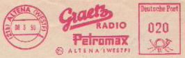 1948 gründete er zusammen mit seinem Bruder Fritz die Graetz KG, und zwar im westfälischen Altena. GRAETZ Kommandit-Gesellschaft, Altena (Westfalen), Westiger Strasse 172, Postfach 48, Fernruf: 2357-2359 Amt Altena (Westf.) Das Gelände und die vorhandenen Fabrikhallen einer ehemaligen Munitionsfabrik von "Thyssen-Krupp" konnten für den Neubeginn genutzt werden. Im November 1948 war das neue Stammwerk fertiggestellt. In rascher Folge weitete sich der Betrieb aus, im Juni 1950 entstand Werk II, im Mai 1951 Werk III - beide ebenfalls in Altena. In der 1949 gegründeten "Bundesrepublik Deutschland" nahmen Erich und Fritz Graetz die Produktion von Radiogeräten erneut auf.