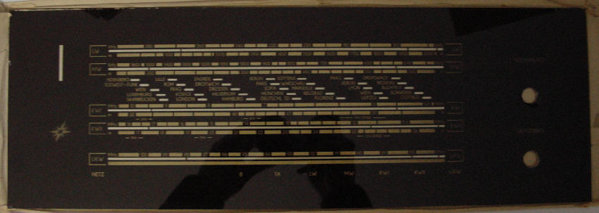 Hier nun eine Skalenscheibe / Skalenglas für ein Rochlitzer Rundfunkgerät, welches bisher unbekannt ist. Informationen hierzu sind immer willkommen... Bezeichnete Tasten für den Tastensatz lauten: B, TA, LW, MW, KW1, KW2, UKW, der UKW Bereich ist auf der Skala bis 100 MHz geführt. Ich danke einem befreundeten Radiosammler aus Hainichen für die Bilderspenden und Informationen. In Literatur über die Firma "Stern Radio Rochlitz wird über eine Weiterentwicklung des "OBERON" etwa 1963 berichtet. Dieses neue Radio - Gerät sollte "FERMATE" genannt werden, wurde aber nie produziert. Auch sind wahrscheinlich keine Entwicklungsunterlagen dieses Gerätes erhalten. Vermutet wird, dass dieses Gerät im VEB "Stern Radio Sonneberg" gefertigt werden sollte.